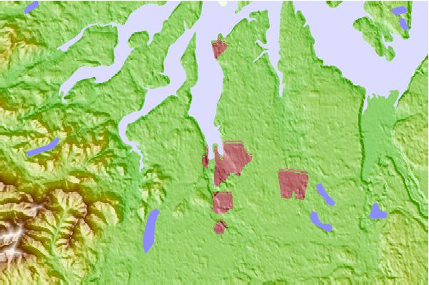 Use this relief map to navigate to tide stations, surf breaks and cities that are in the area of Olympia, Budd Inlet, Puget Sound, Washington.
