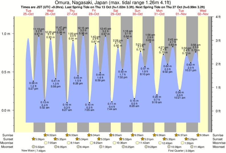 Tide Times are JST (UTC +9.0hrs). Last Spring High Tide at Omura was on Sun 07 Dec (height: 0.86m 2.8ft). Next high Spring Tide at Omura will be on Sun 21 Dec (height: 0.81m 2.7ft).