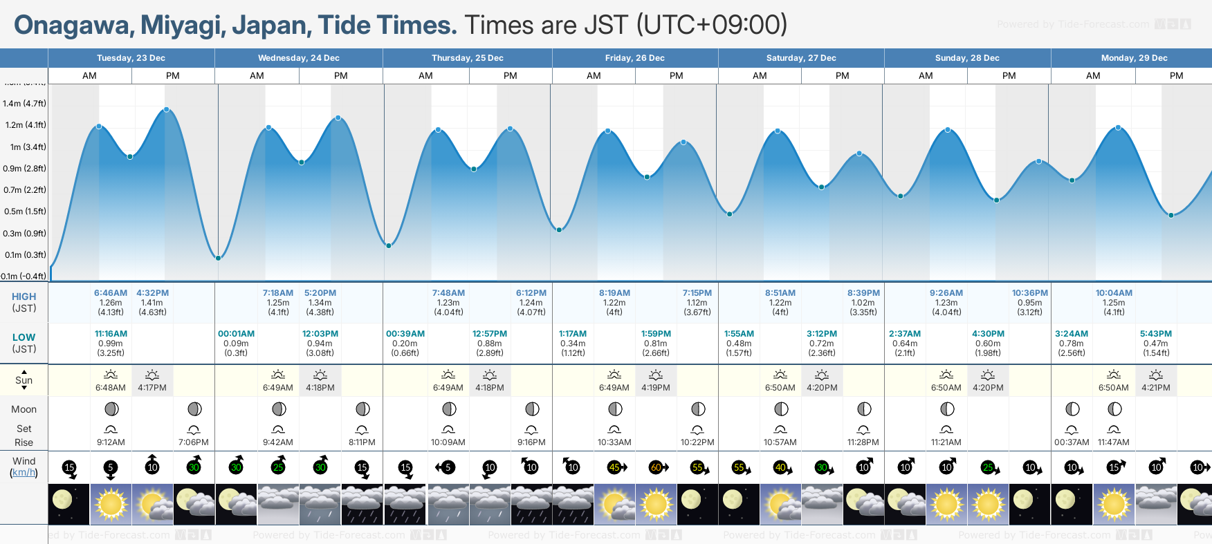 December and January Tide charts for Onagawa: The tide charts below show the height, time and date of high and low tides for the next 30 days.