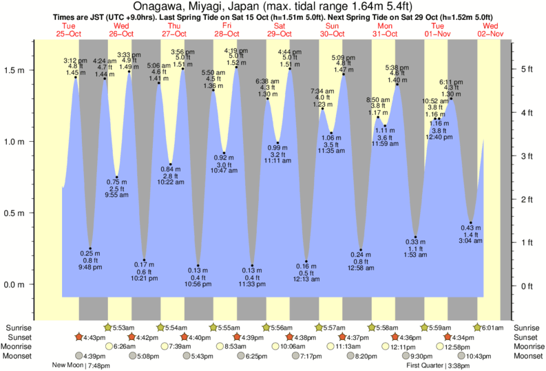 Tide Times are JST (UTC +9.0hrs). Last Spring High Tide at Onagawa was on Sat 20 Dec (height: 1.48m 4.9ft). Next high Spring Tide at Onagawa will be on Sun 04 Jan (height: 1.44m 4.7ft).