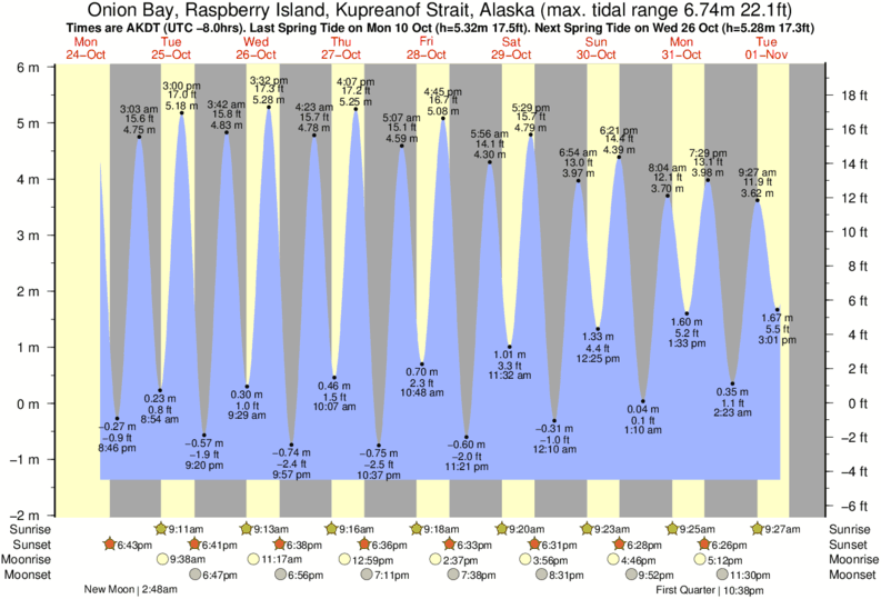 Tide chart for Onion Bay, Raspberry Island, Kupreanof StraitShowing low and high tide times for the next 30 days at Onion Bay, Raspberry Island, Kupreanof Strait. Tide Times are AKST (UTC -9.0hrs).
