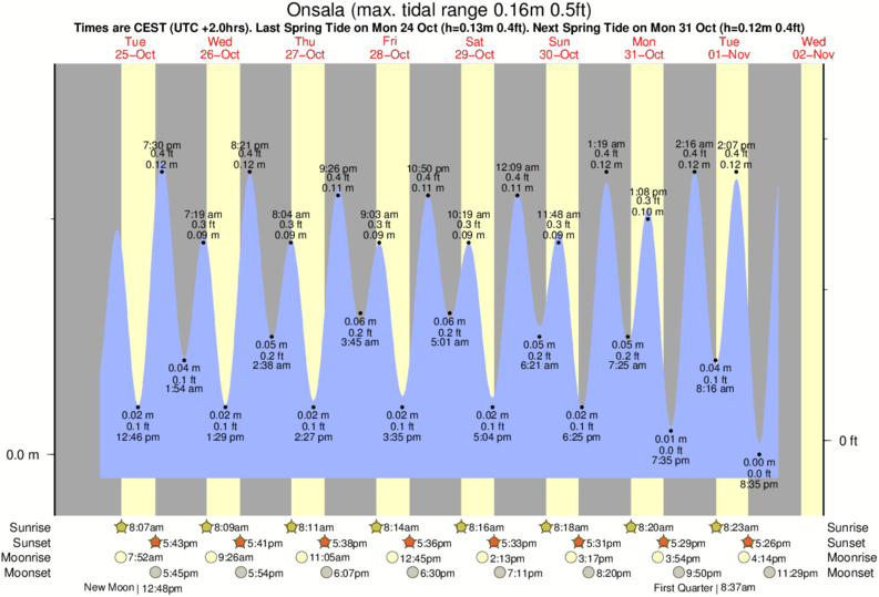 Tide Times are CET (UTC +1.0hrs). Last Spring High Tide at Onsala was on Fri 19 Dec (height: 0.15m 0.5ft). Next high Spring Tide at Onsala will be on Fri 02 Jan (height: 0.15m 0.5ft).