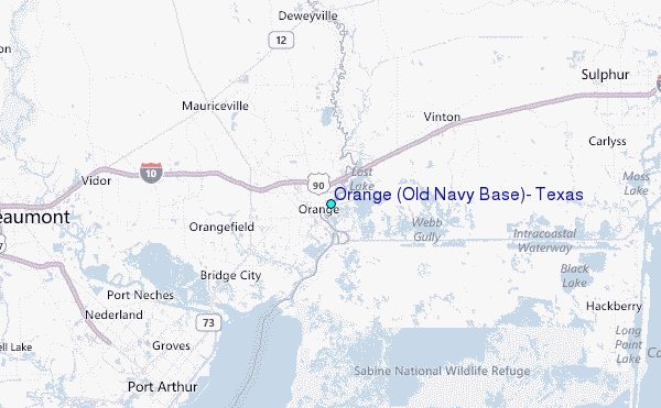 Use this relief map to navigate to tide stations, surf breaks and cities that are in the area of Orange (Old Navy Base), Texas.