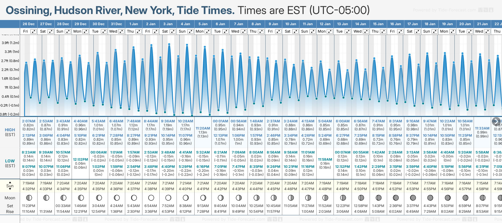 December and January Tide charts for Ossining, Hudson River: The tide charts below show the height, time and date of high and low tides for the next 30 days.