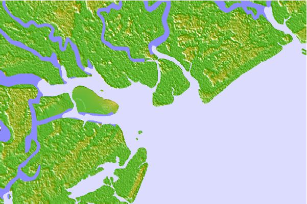Use this relief map to navigate to tide stations, surf breaks and cities that are in the area of Otter Island, South Carolina.