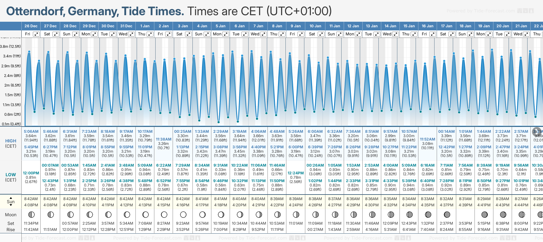 Tide Times are CET (UTC +1.0hrs). Last Spring High Tide at Otterndorf was on Tue 23 Dec (height: 3.85m 12.6ft). Next high Spring Tide at Otterndorf will be on Wed 07 Jan (height: 3.66m 12.0ft).