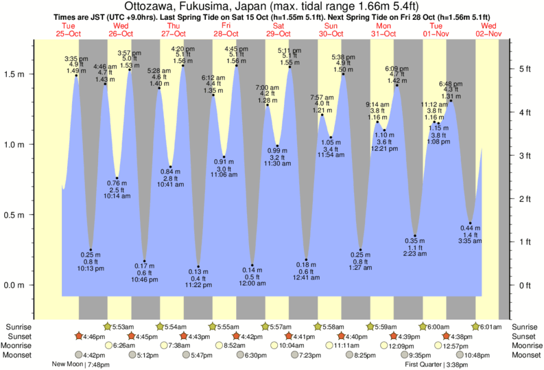Ottozawa tide chart key: The tide chart above shows the height and times of high tide and low tide for Ottozawa, Fukusima, Japan. The grey shading corresponds to nighttime hours between sunset and sunrise at Ottozawa.