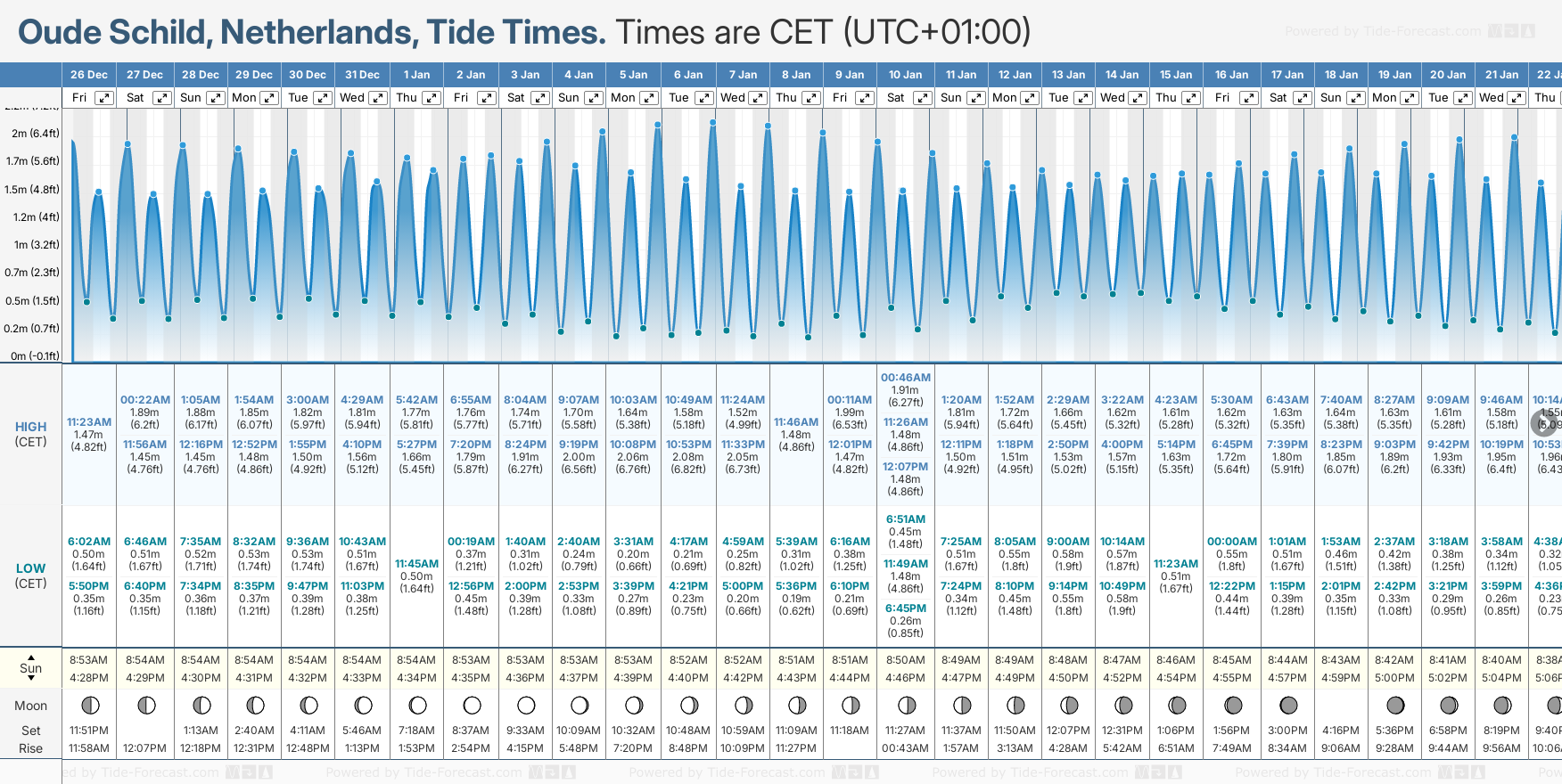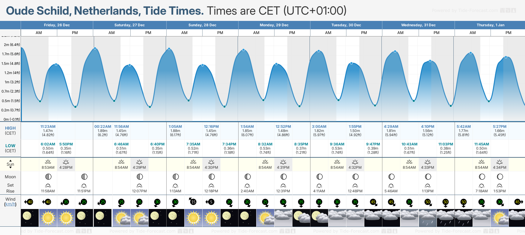 December and January Tide charts for Oude Schild: The tide charts below show the height, time and date of high and low tides for the next 30 days.