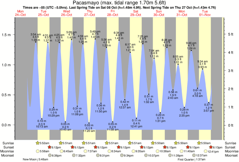Tide Times are -05 (UTC -5.0hrs). Last Spring High Tide at Pacasmayo was on Sat 06 Dec (height: 1.55m 5.1ft). Next high Spring Tide at Pacasmayo will be on Sun 21 Dec (height: 1.32m 4.3ft).