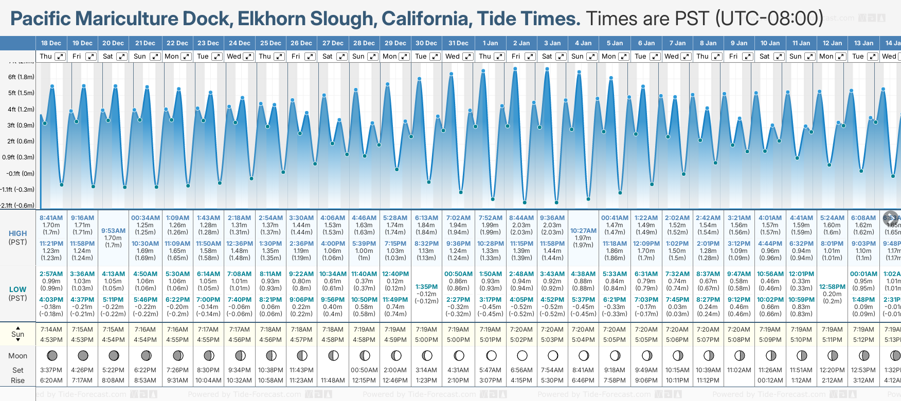 December and January Tide charts for Pacific Mariculture Dock, Elkhorn Slough: The tide charts below show the height, time and date of high and low tides for the next 30 days.