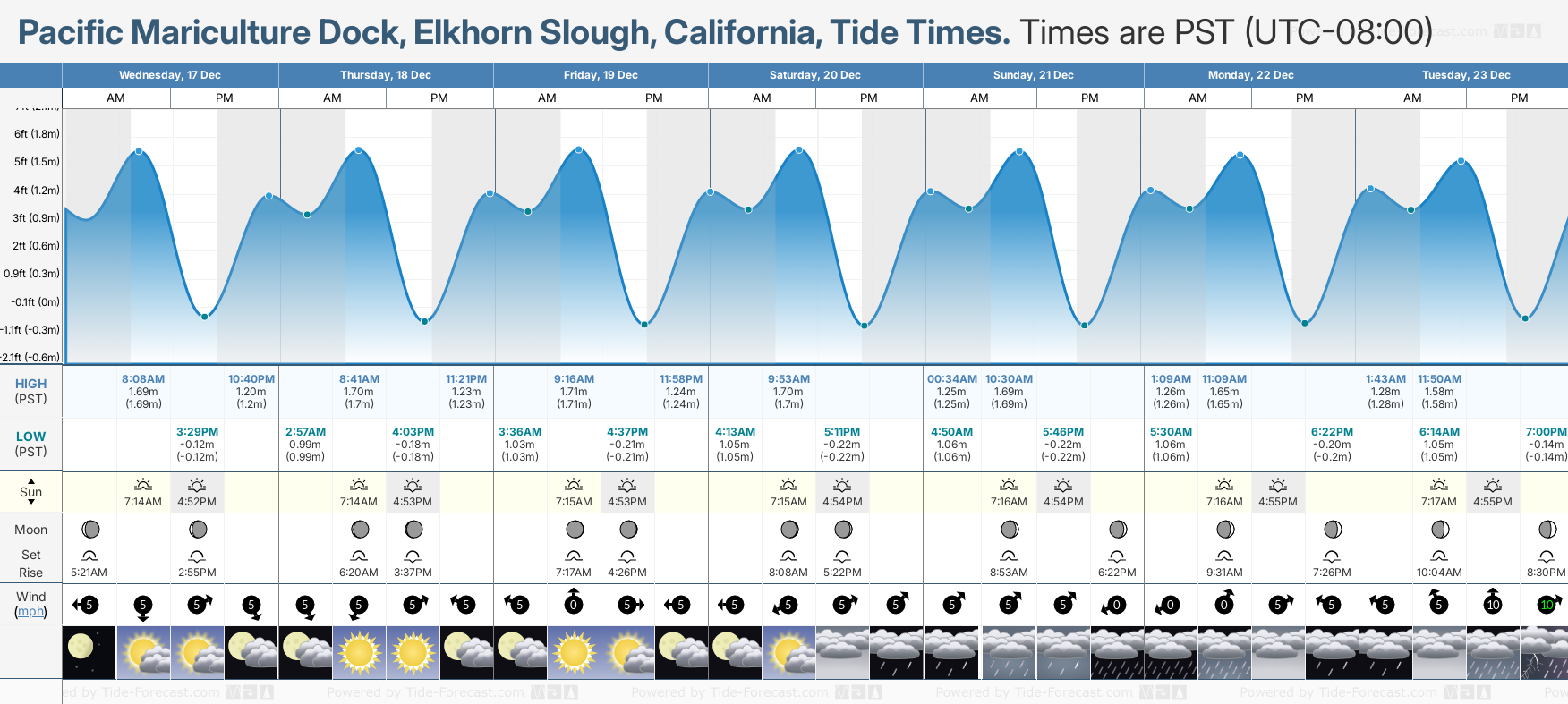Tide chart for Pacific Mariculture Dock, Elkhorn SloughShowing low and high tide times for the next 30 days at Pacific Mariculture Dock, Elkhorn Slough. Tide Times are PST (UTC -8.0hrs).