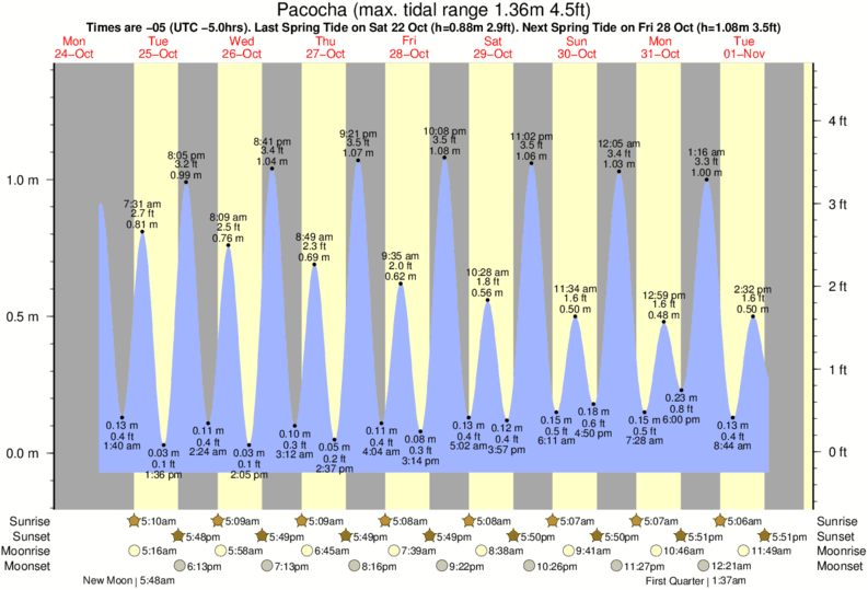 Tide Times are -05 (UTC -5.0hrs). Last Spring High Tide at Pacocha was on Sat 06 Dec (height: 1.26m 4.1ft). Next high Spring Tide at Pacocha will be on Sat 03 Jan (height: 1.26m 4.1ft).