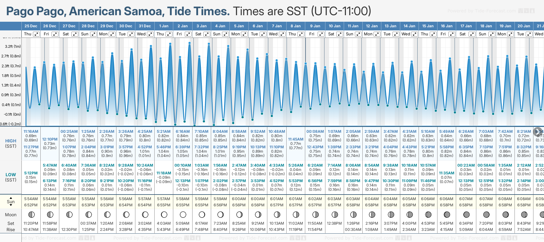 December and January Tide charts for Pago Pago, American Samoa: The tide charts below show the height, time and date of high and low tides for the next 30 days.