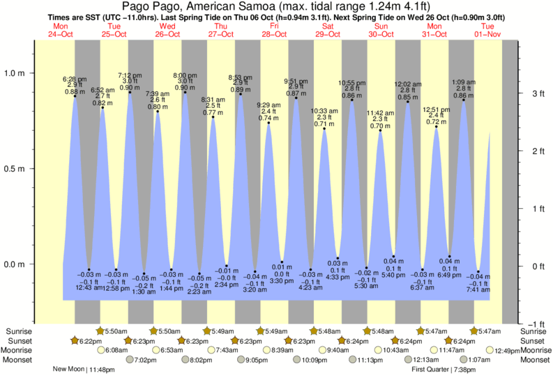 Tide chart for Pago Pago, American SamoaShowing low and high tide times for the next 30 days at Pago Pago, American Samoa. Tide Times are SST (UTC -11.0hrs).