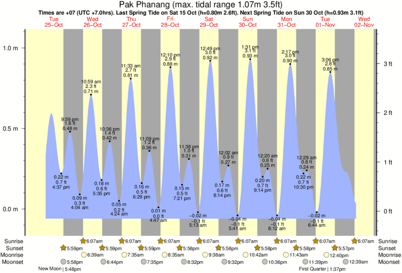 Tide Times are +07 (UTC +7.0hrs). Last Spring High Tide at Pak Phanang was on Sun 07 Dec (height: 1.01m 3.3ft). Next high Spring Tide at Pak Phanang will be on Tue 23 Dec (height: 0.87m 2.9ft).
