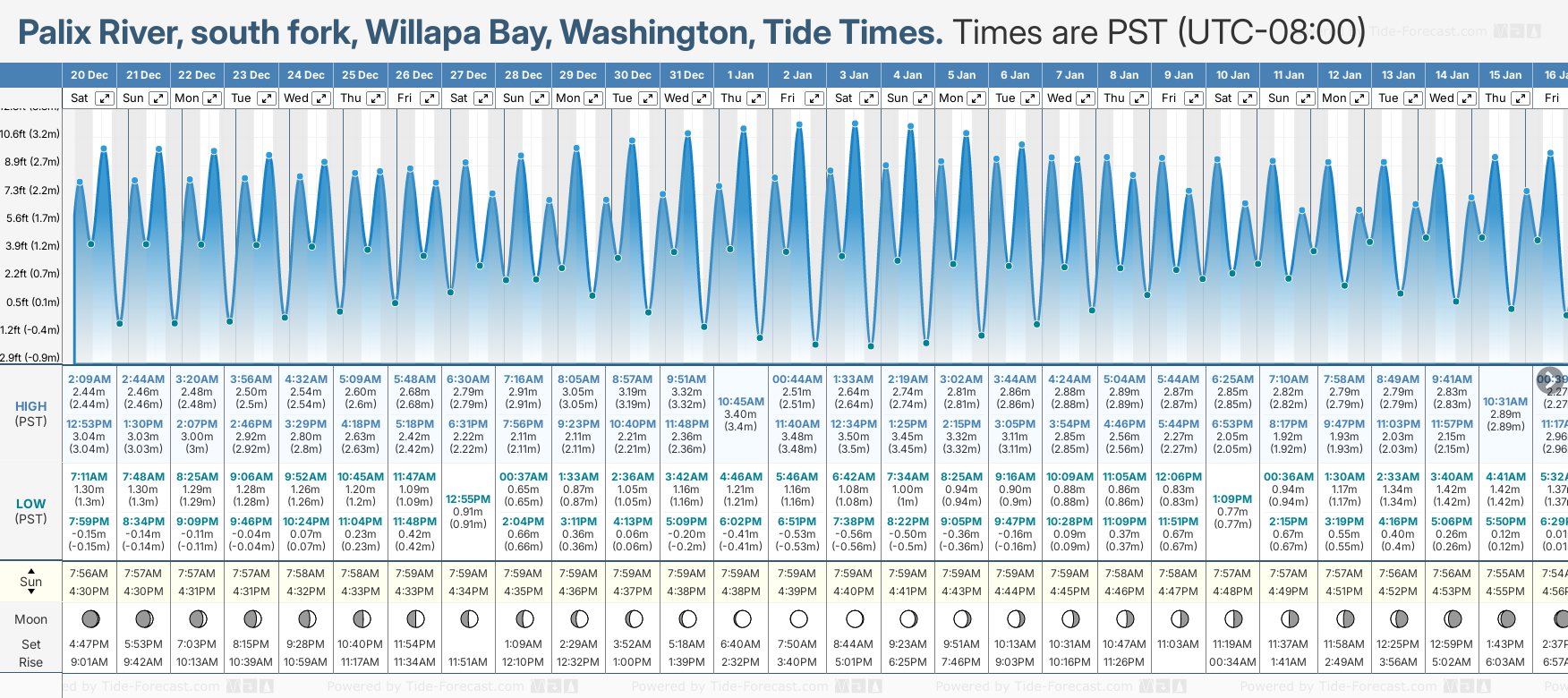 December and January Tide charts for Palix River, south fork, Willapa Bay: The tide charts below show the height, time and date of high and low tides for the next 30 days.