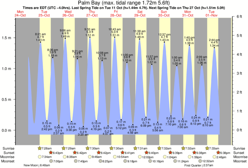 Tide chart for Palm BayShowing low and high tide times for the next 30 days at Palm Bay. Tide Times are EST (UTC -5.0hrs).
