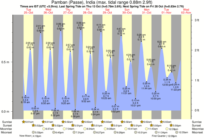 Tide Times are IST (UTC +5.5hrs). Last Spring High Tide at Pamban (Passe) was on Sat 06 Dec (height: 0.89m 2.9ft). Next high Spring Tide at Pamban (Passe) will be on Mon 22 Dec (height: 0.82m 2.7ft).