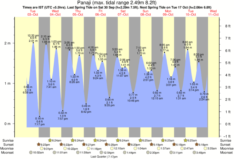 Tide Times are IST (UTC +5.5hrs). Last Spring High Tide at Panaji was on Sat 06 Dec (height: 2.33m 7.6ft). Next high Spring Tide at Panaji will be on Wed 24 Dec (height: 2.11m 6.9ft).