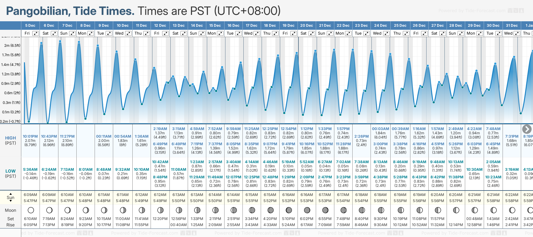Tide chart for PangobilianShowing low and high tide times for the next 30 days at Pangobilian. Tide Times are PST (UTC +8.0hrs).