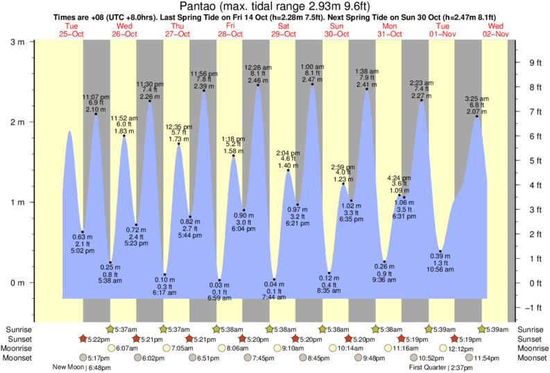Tide Times are PST (UTC +8.0hrs). Last Spring High Tide at Pantao was on Sun 07 Dec (height: 2.72m 8.9ft). Next high Spring Tide at Pantao will be on Tue 23 Dec (height: 2.42m 7.9ft).