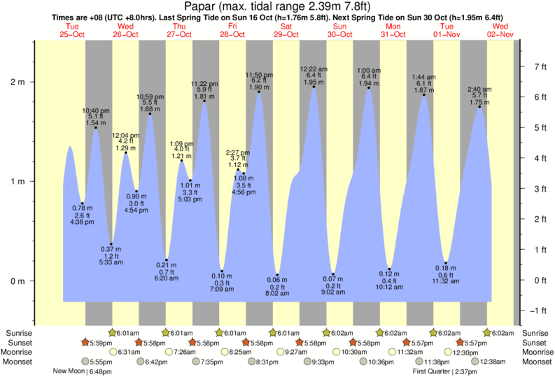 Tide Times are +08 (UTC +8.0hrs). Last Spring High Tide at Papar was on Sun 07 Dec (height: 2.17m 7.1ft). Next high Spring Tide at Papar will be on Tue 23 Dec (height: 1.96m 6.4ft).