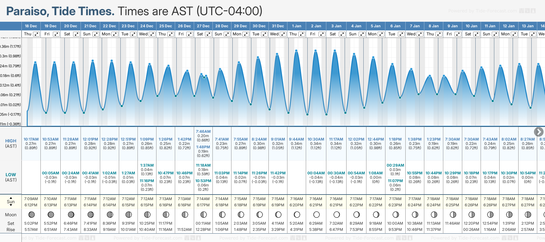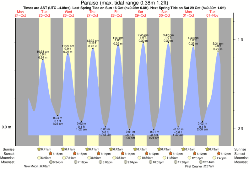 Tide Times are AST (UTC -4.0hrs). Last Spring High Tide at Paraiso was on Tue 16 Dec (height: 0.27m 0.9ft). Next high Spring Tide at Paraiso will be on Thu 01 Jan (height: 0.34m 1.1ft).