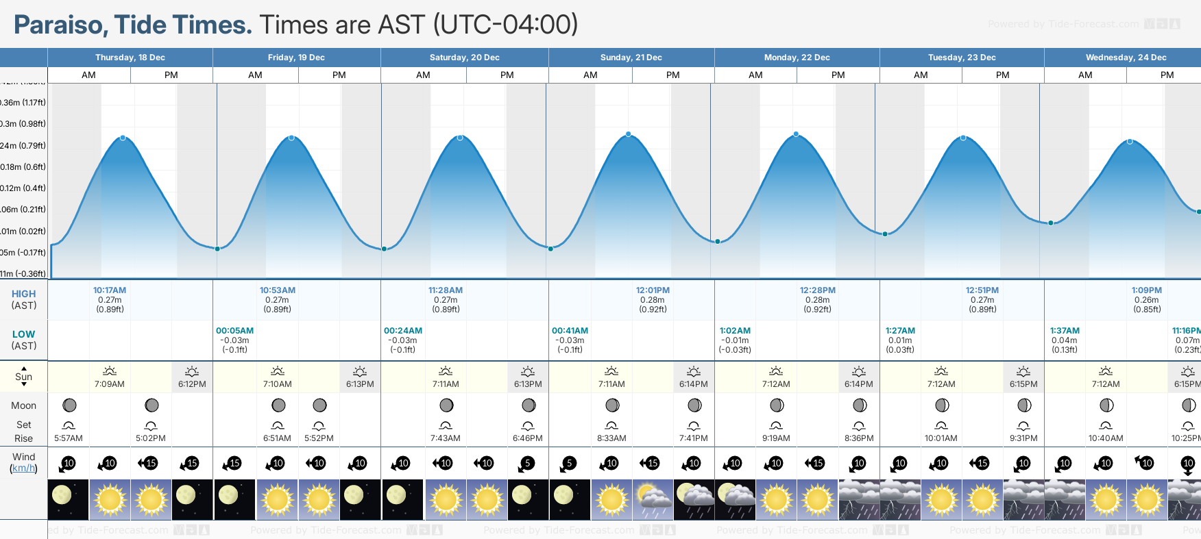 Tide chart for ParaisoShowing low and high tide times for the next 30 days at Paraiso. Tide Times are AST (UTC -4.0hrs).