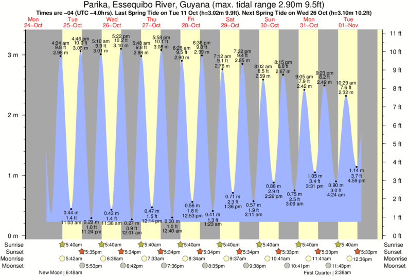 Tide Times are -04 (UTC -4.0hrs). Last Spring High Tide at Parika, Essequibo River was on Fri 05 Dec (height: 3.05m 10.0ft). Next high Spring Tide at Parika, Essequibo River will be on Sun 21 Dec (height: 2.78m 9.1ft).