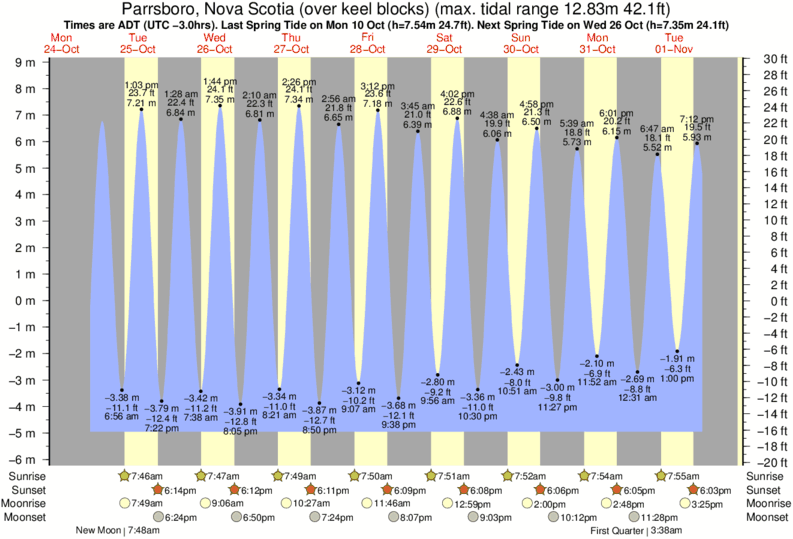Tide Times are AST (UTC -4.0hrs). Last Spring High Tide at Parrsboro (over keel blocks) was on Fri 05 Dec (height: 7.80m 25.6ft). Next high Spring Tide at Parrsboro (over keel blocks) will be on Sun 21 Dec (height: 6.64m 21.8ft).