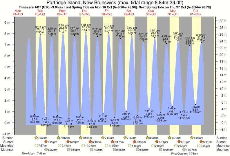 Tide Times are AST (UTC -4.0hrs). Last Spring High Tide at Partridge Island was on Fri 05 Dec (height: 8.58m 28.1ft). Next high Spring Tide at Partridge Island will be on Sun 21 Dec (height: 7.36m 24.1ft).