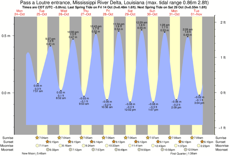 December and January Tide charts for Pass a Loutre entrance River Delta: The tide charts below show the height, time and date of high and low tides for the next 30 days.