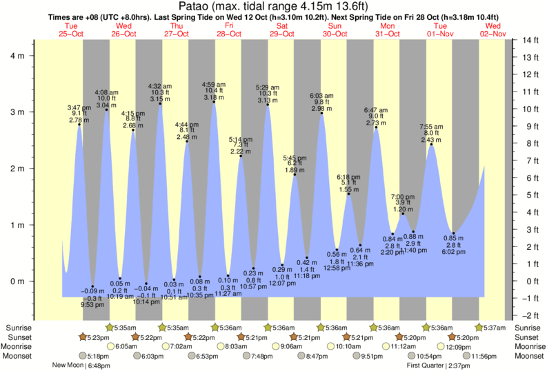 Tide Times are PST (UTC +8.0hrs). Last Spring High Tide at Patao was on Sun 07 Dec (height: 3.53m 11.6ft). Next high Spring Tide at Patao will be on Mon 05 Jan (height: 3.66m 12.0ft).