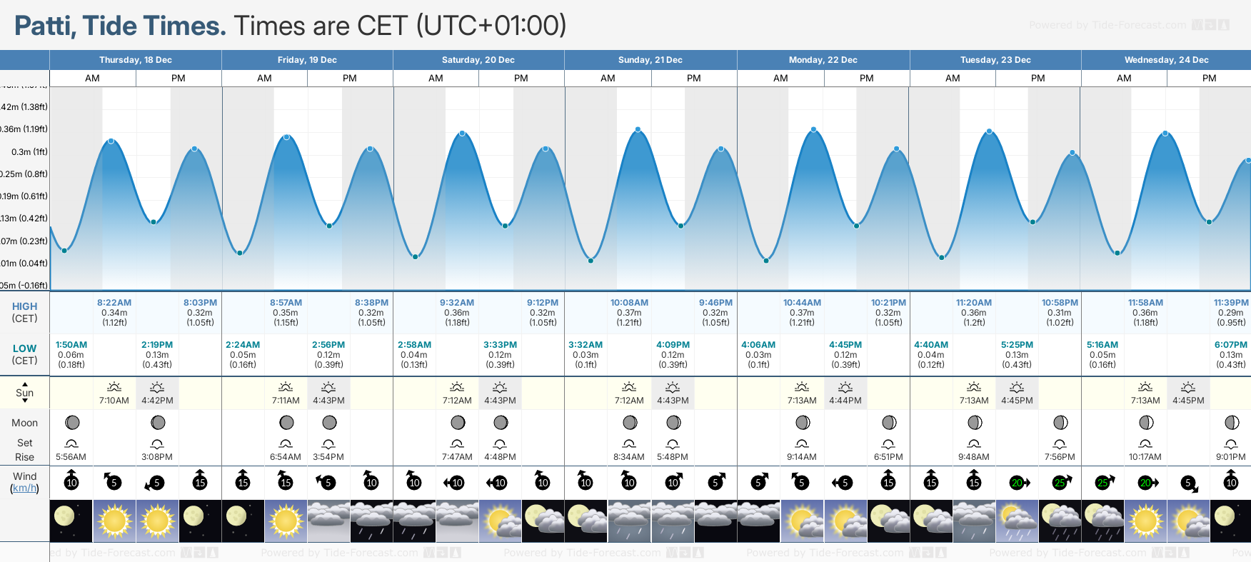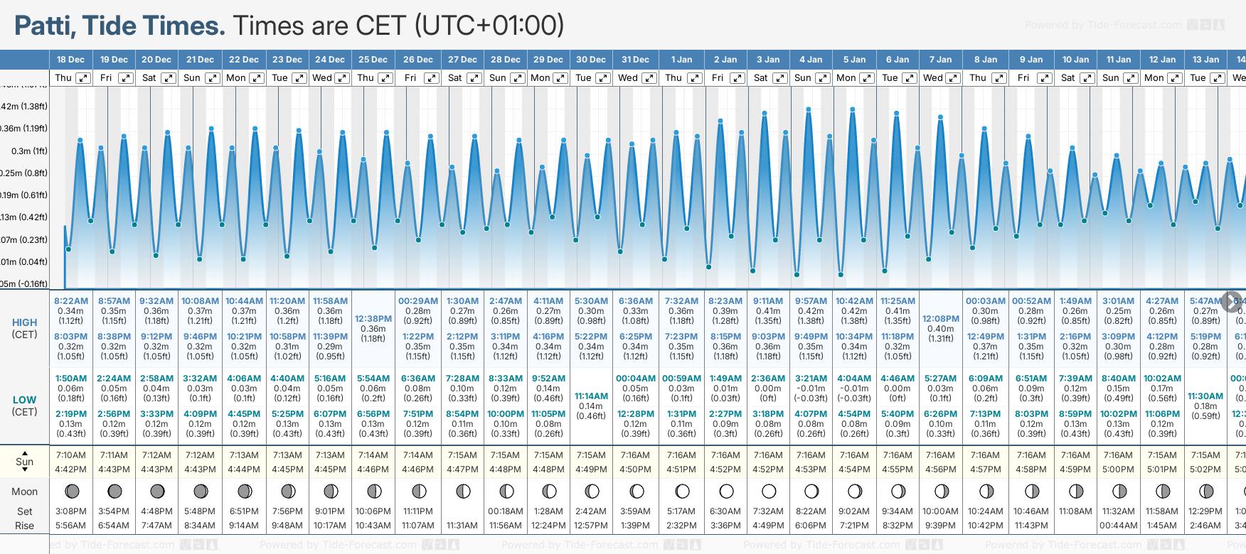 Tide Times are CET (UTC +1.0hrs). Last Spring High Tide at Patti was on Sun 07 Dec (height: 0.41m 1.3ft). Next high Spring Tide at Patti will be on Sun 21 Dec (height: 0.37m 1.2ft).