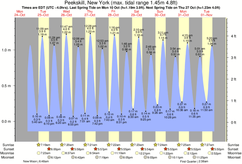 Tide Times are EST (UTC -5.0hrs). Last Spring High Tide at Peekskill was on Fri 05 Dec (height: 1.26m 4.1ft). Next high Spring Tide at Peekskill will be on Sun 21 Dec (height: 1.04m 3.4ft).