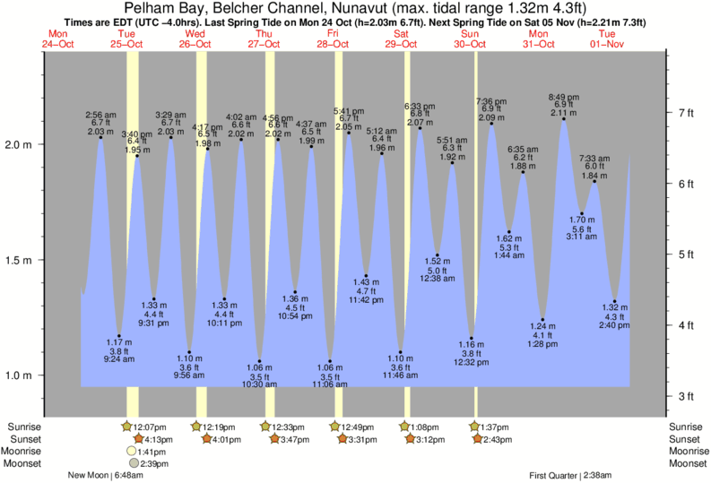 Pelham Bay, Belcher Channel tide chart key: The tide chart above shows the height and times of high tide and low tide for Pelham Bay, Belcher Channel, Nunavut. The grey shading corresponds to nighttime hours between sunset and sunrise at Pelham Bay, Belcher Channel.