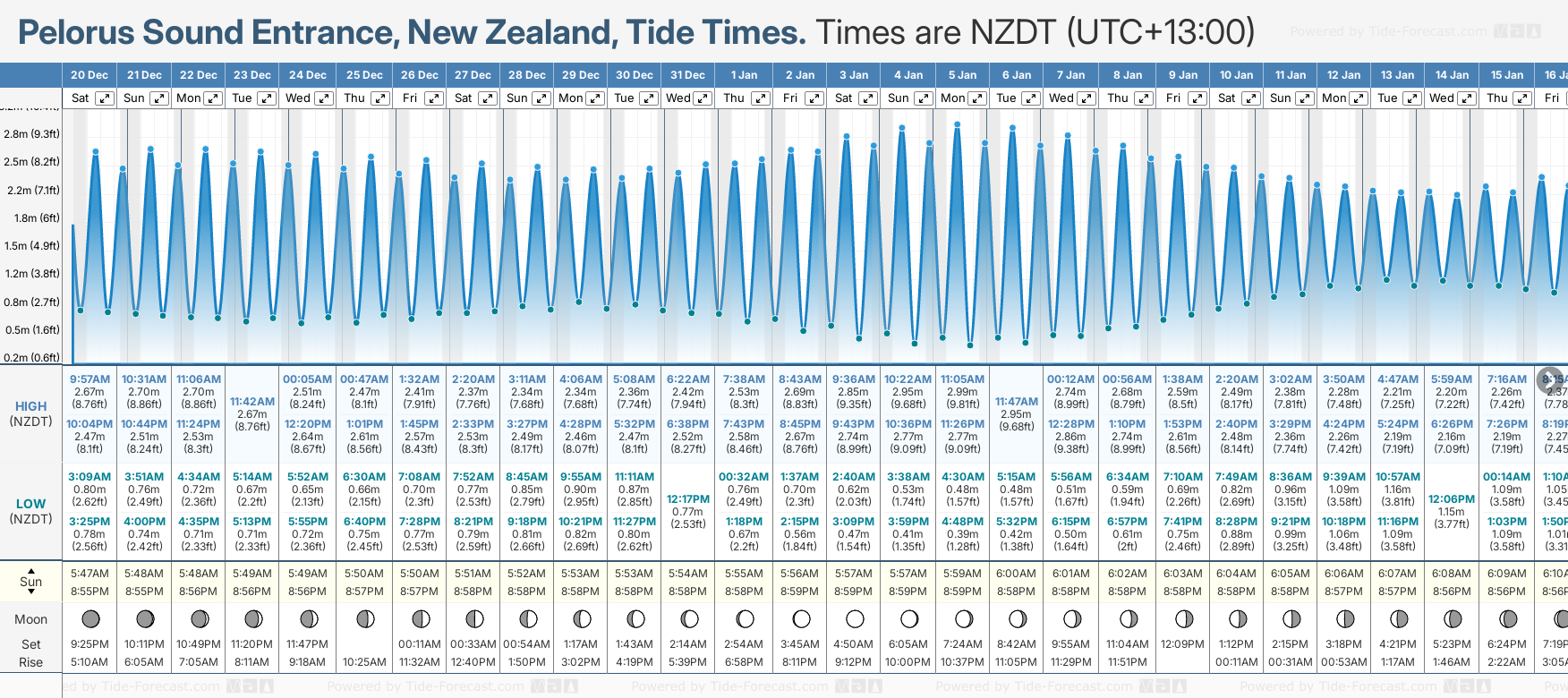 December and January Tide charts for Pelorus Sound Entrance: The tide charts below show the height, time and date of high and low tides for the next 30 days.