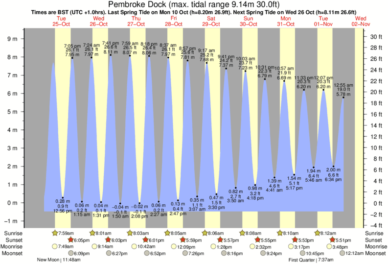 December and January Tide charts for Pembroke Dock: The tide charts below show the height, time and date of high and low tides for the next 30 days.