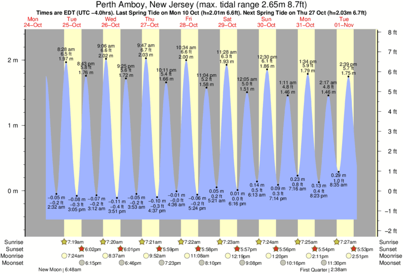 Tide Times are EST (UTC -5.0hrs). Last Spring High Tide at Perth Amboy was on Fri 19 Dec (height: 1.74m 5.7ft). Next high Spring Tide at Perth Amboy will be on Sat 03 Jan (height: 2.02m 6.6ft).