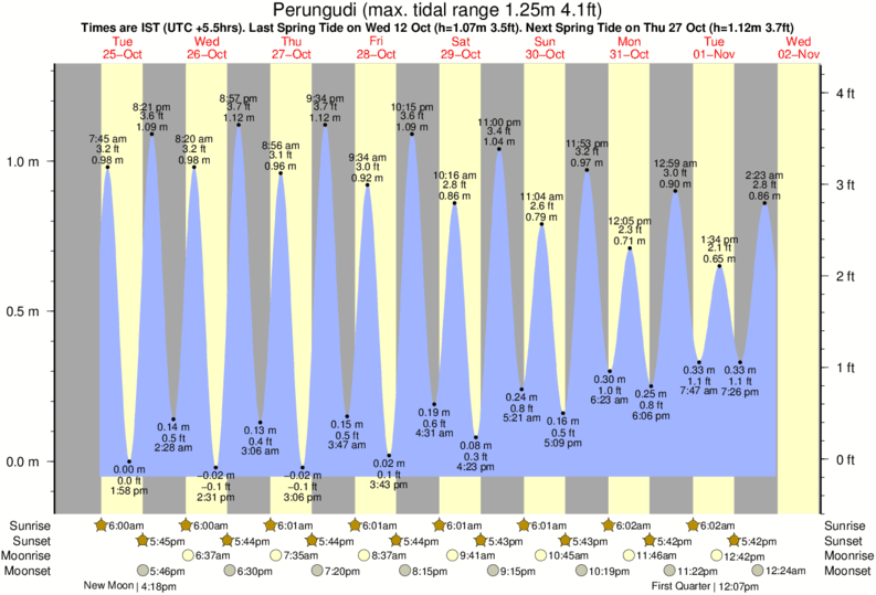 Tide Times are IST (UTC +5.5hrs). Last Spring High Tide at Perungudi was on Sat 06 Dec (height: 1.16m 3.8ft). Next high Spring Tide at Perungudi will be on Tue 23 Dec (height: 1.03m 3.4ft).