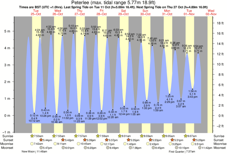 December and January Tide charts for Peterlee: The tide charts below show the height, time and date of high and low tides for the next 30 days.