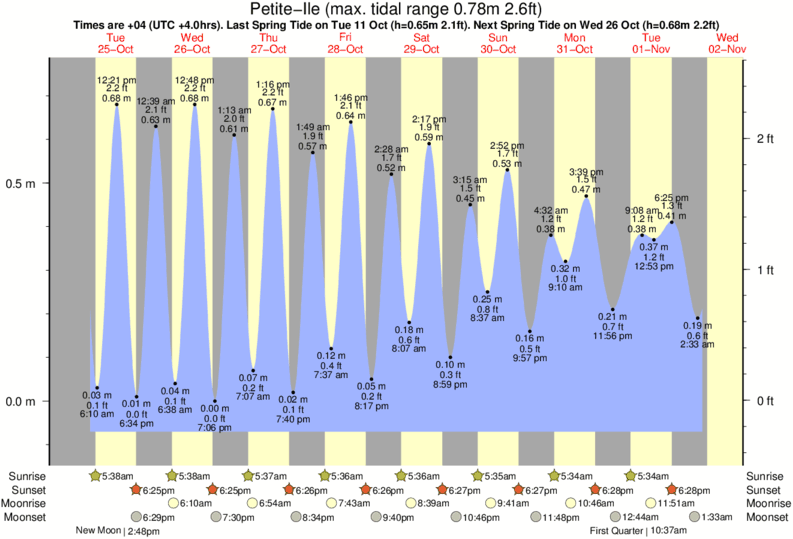 Tide Times are +04 (UTC +4.0hrs). Last Spring High Tide at Petite-Ile was on Fri 05 Dec (height: 0.67m 2.2ft). Next high Spring Tide at Petite-Ile will be on Mon 22 Dec (height: 0.61m 2.0ft).