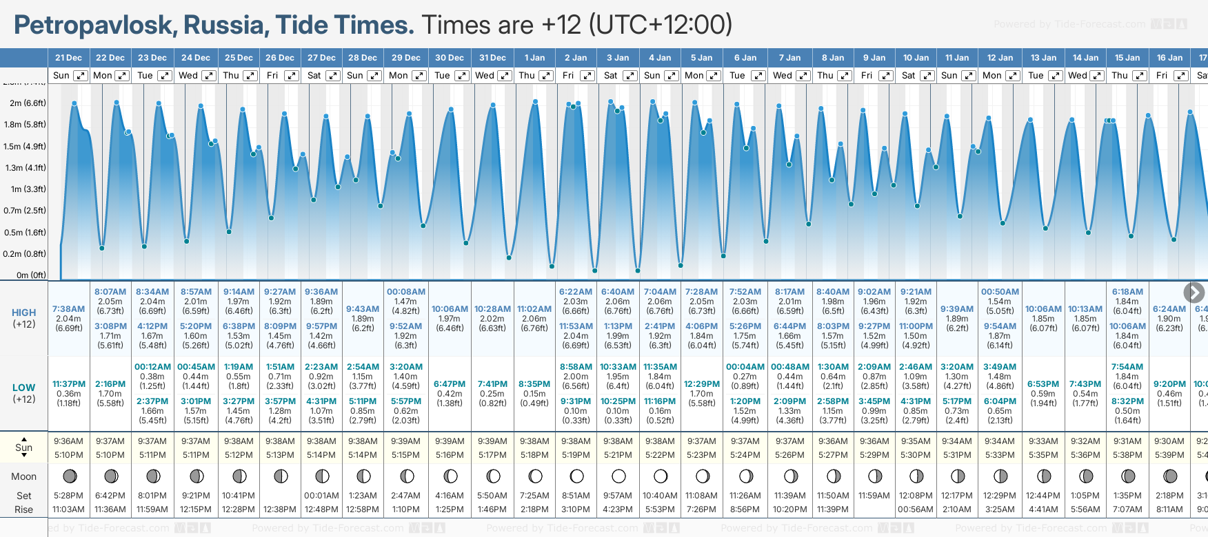 December and January Tide charts for Petropavlosk: The tide charts below show the height, time and date of high and low tides for the next 30 days.