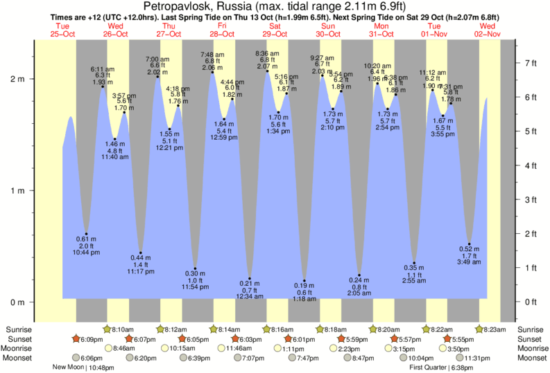 Tide Times are +12 (UTC +12.0hrs). Last Spring High Tide at Petropavlosk was on Sat 06 Dec (height: 2.15m 7.1ft). Next high Spring Tide at Petropavlosk will be on Mon 22 Dec (height: 2.05m 6.7ft).