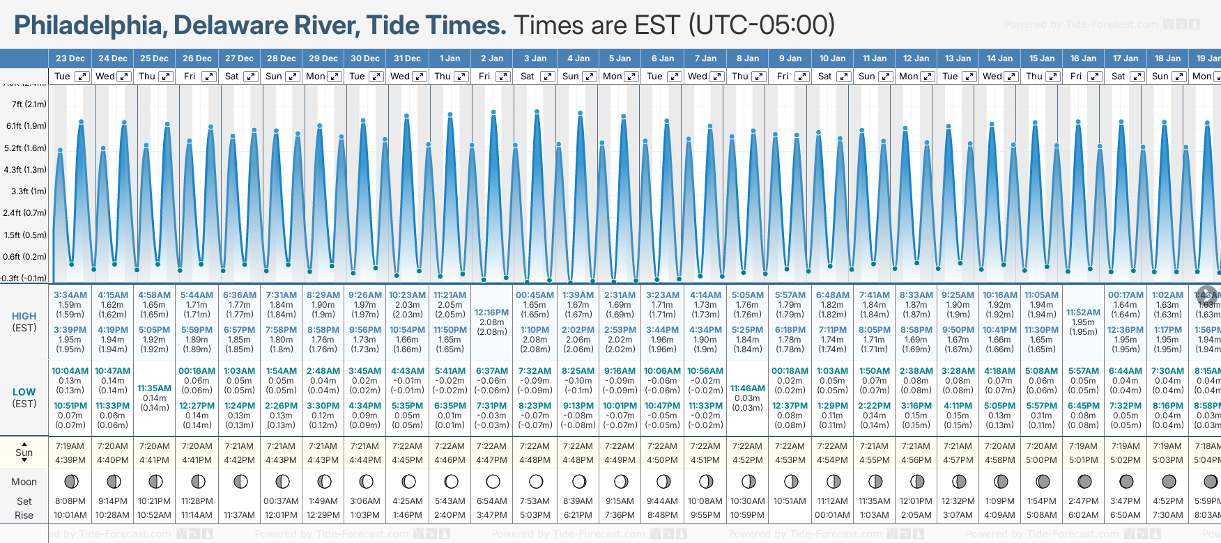 December and January Tide charts for Philadelphia River: The tide charts below show the height, time and date of high and low tides for the next 30 days.