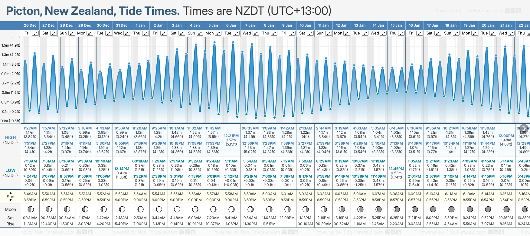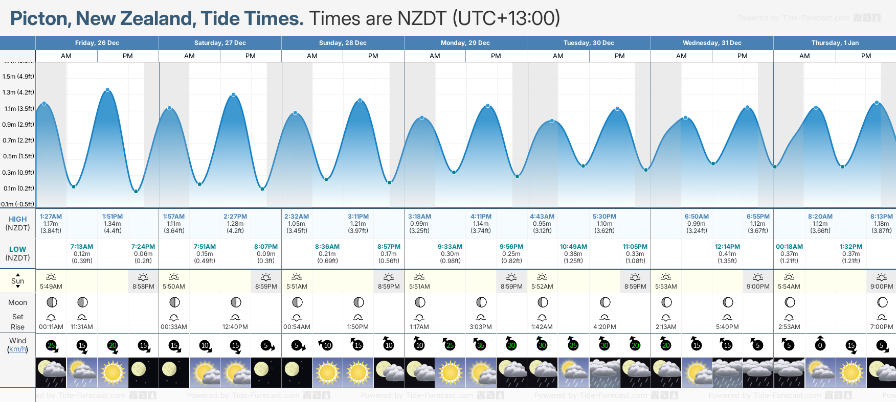 December and January Tide charts for Picton: The tide charts below show the height, time and date of high and low tides for the next 30 days.