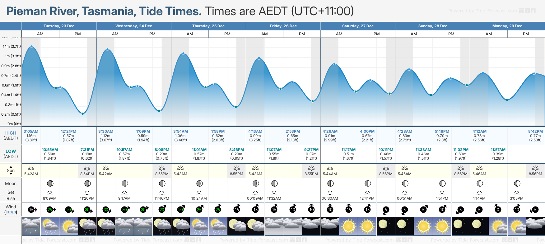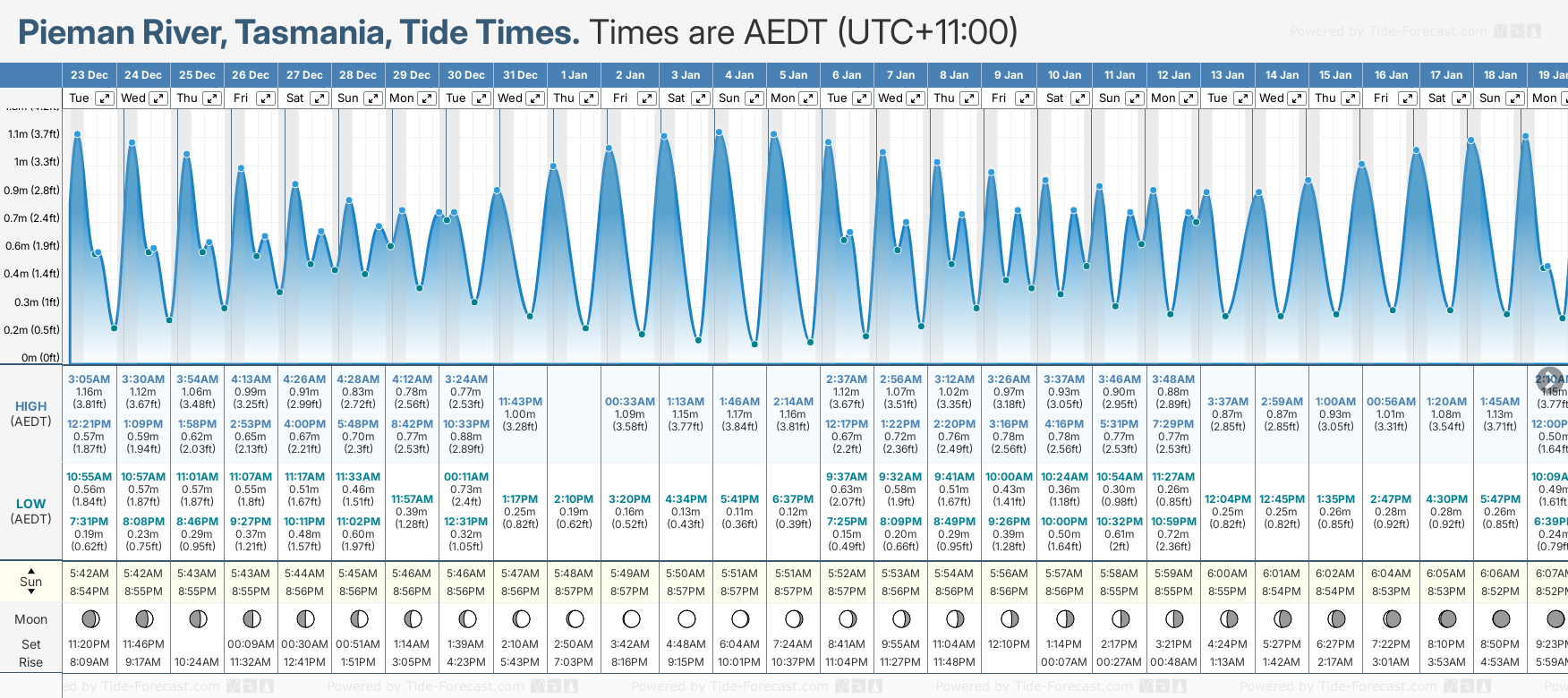 December and January Tide charts for Pieman River: The tide charts below show the height, time and date of high and low tides for the next 30 days.