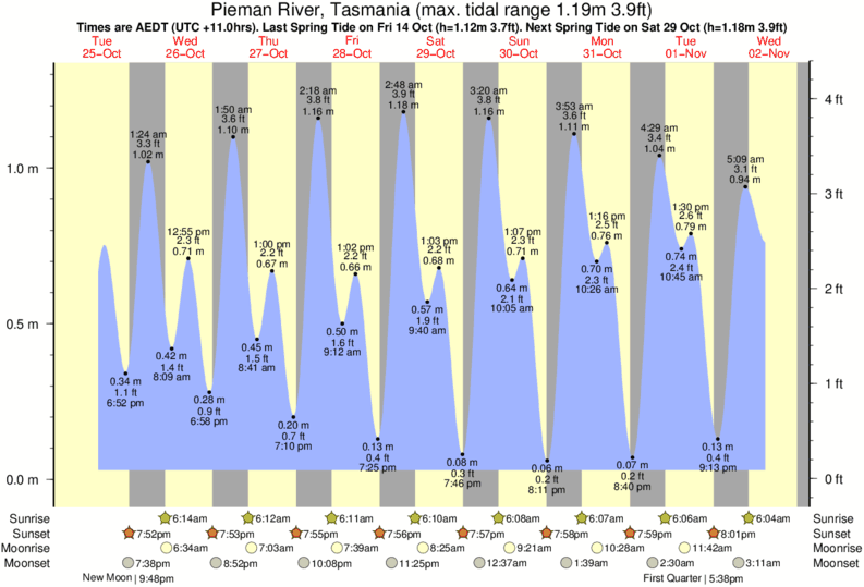 Tide Times are AEDT (UTC +11.0hrs). Last Spring High Tide at Pieman River was on Sun 07 Dec (height: 1.22m 4.0ft). Next high Spring Tide at Pieman River will be on Sun 04 Jan (height: 1.17m 3.8ft).