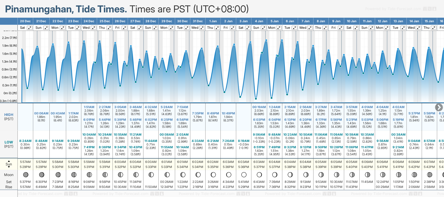 December and January Tide charts for Pinamungahan: The tide charts below show the height, time and date of high and low tides for the next 30 days.