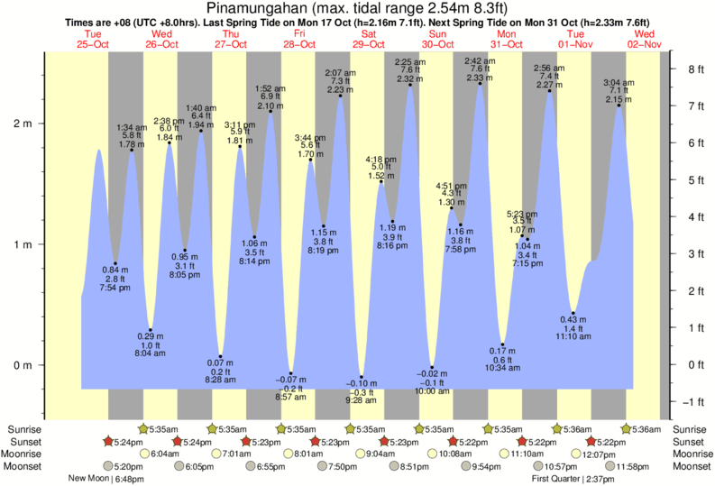 Tide Times are PST (UTC +8.0hrs). Last Spring High Tide at Pinamungahan was on Mon 08 Dec (height: 2.25m 7.4ft). Next high Spring Tide at Pinamungahan will be on Wed 24 Dec (height: 2.06m 6.8ft).